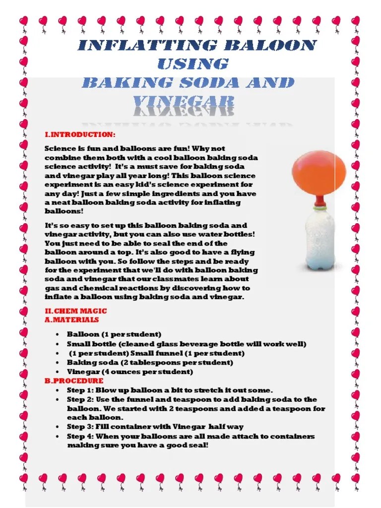 How to inflate a balloon with baking soda and vinegar. 01/01/2014 · stretch the balloon well. Rinse the funnel and then use it to add the 1 cup of vinegar to the bottle. Use the funnel to add the 1/3 cup of baking soda into the balloon. Use a funnel and a spoon to get 1 tablespoon of baking soda into the balloon.